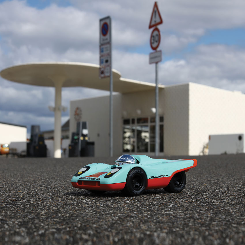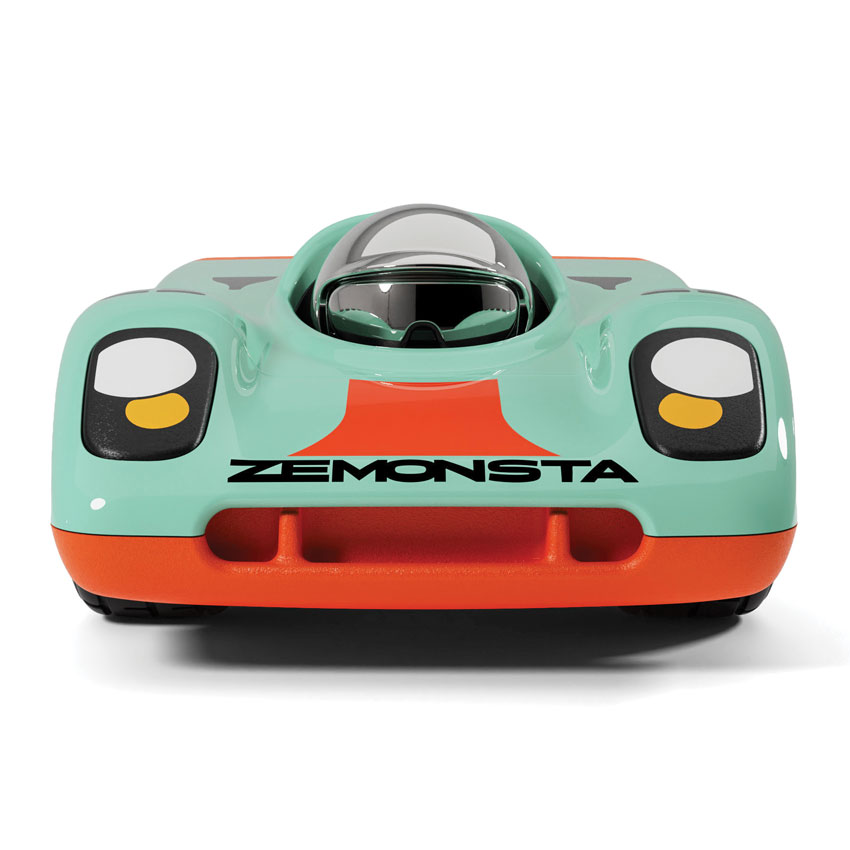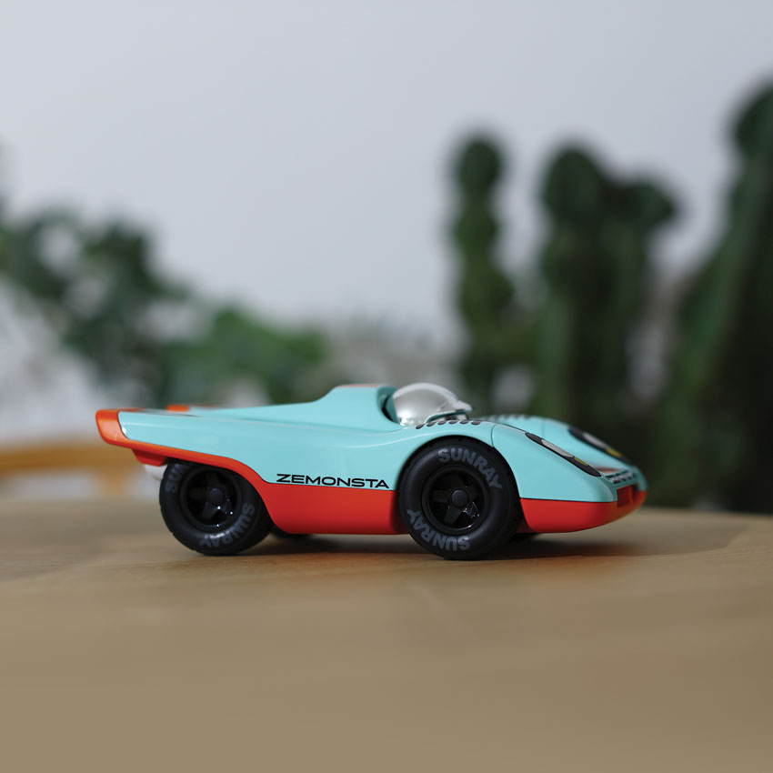 Block your ears, Zemonsta is firing up and even when idling one's skin begins to crawl. Another formidable and fierce track eater has arrived, and we think Ken could be a little nervous (we're shaking too). Gorging on chunks of inspiration from the iconic Porsche 917 we at Playforever set out to abstract the beast of beasts. In fact, with all the Zemonsta untamed fury, we'll probably need to unload some extra rows of Sunray tyres for test day. Finished in a striking light blue and orange colourway, Klaus channels pure racing heritage with a bold modern edge. Zemonsta is hungry, move out of the way or be devoured!